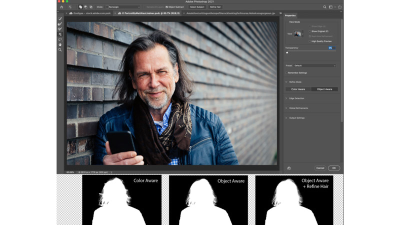 الميزة الأقل “إثارة” من هذه الاضافات ولكن أكثرها عملانية هي إضافة أداتين جديدتين في ادوات التحديد والاقنعة وهما Refine Hair و Object Aware Refine Mode، اداة Refine Hair الموجود الآن في أعلى يمين شريط أدوات التحديد والقناع، تقوم بعمل فرشاة Refine Edge نيابة عنك وتحاول تحديد شعر الشخص او الموضوع بذكاء، حتى لو كان يقف في بيئة مزدحمة، الهدف كما تقول ادوبي هو تحسين هذه الميزات كثيرًا بحيث يمكن اختيار الموضوع وتحديده بنقرتين، اختيار الموضوع + تنقية الشعر.