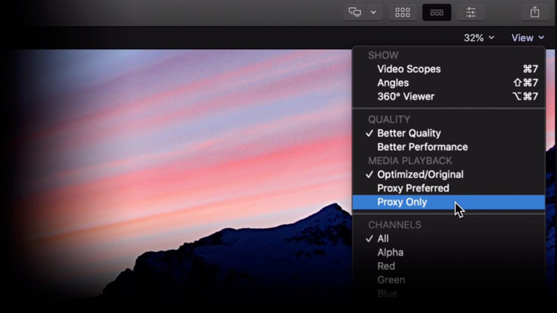 ستستطيع زيادة الأداء إلى أقصى حد عن طريق إنشاء نسخ بروكسي من الوسائط بحجم صغير يصل إلى 1/8 بتشفير ProRes Proxy أو H.264، يتيح لك أحدث محرك بروكسي إنشاء نسخة وكيل فقط من مكتبتك لمشاركتها محليًا أو عبر السحابة مع امكانية عرض الوسائط الأصلية في حالة عدم توفر نسخة البروكسي، يمكن أيضًا لاضافات الطرف الثالث الخارجية مثل إطار تطبيق المراجعة والموافقة إنشاء وكلاء وإرسالها إلى مكتبة Final Cut Pro.