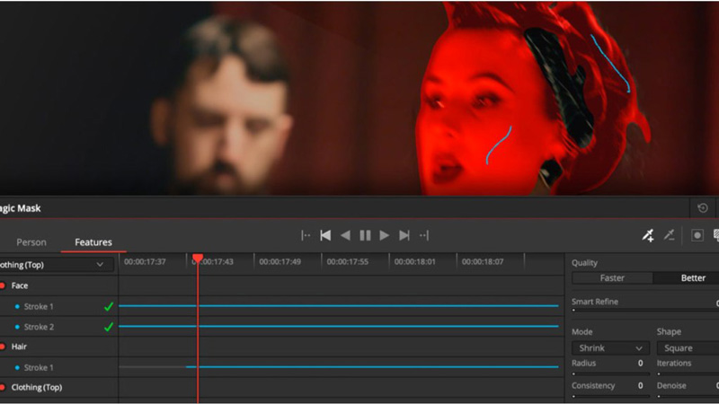 تم تبسيط اختيار الأشخاص وتتبعهم للقيام بالتصحيح المستهدف، تستخدم هذه الميزة محرك DaVinci العصبي لإنشاء أقنعة تلقائيًا لشخص بأكمله أو ميزات محددة مثل الوجه أو الذراعين، يمكنك ايضاً ضبط الاقنعة عبر اداة تحسين القناع Matte Finess والقدرة على إضافة وإزالة الزوائد والتتبع التلقائي.