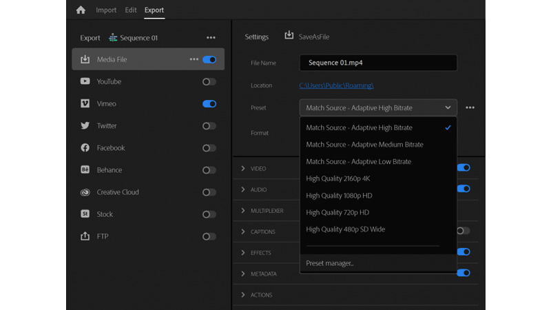 أفضل ميزة في وضع التصدير الجديد هي أنه يسمح بتصدير متسلسل متعدد مع وجهات إخراج وتنسيقات مختلفة، سيوفر لك هذا بشكل أساسي الحاجة إلى الانتقال إلى Adobe Media Encoder في كل مرة إذا كنت بحاجة فقط إلى إصدارين مختلفين من ملفك.