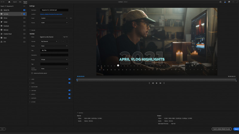 اضافت ادوبي أيضًا القدرة على التحميل مباشرة إلى يوتيوب مع القدرة على تعيين خصوصيتك عند التحميل بحيث لا يتم نشرها تلقائيًا، هناك أيضًا عدد من خيارات الإخراج الأخرى الى Vimeo و Twitter و فيسبوك على سبيل المثال لا الحصر.
