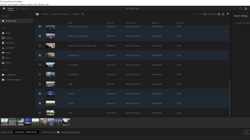 مع التركيز على بدء عملية المونتاج قامت ادوبي بانشاء شاشة بدء جديدة تحتوي على زر انشاء “مشروع جديد” ستأخذك الى نافذة جديدة تسمى” وضع الاستيراد ” حيث ستبدأ النظر على الفور في المقاطع والوسائط التي يمكنك تحريكها ومسحها ضوئيًا أثناء التنقل عبر الدلائل.