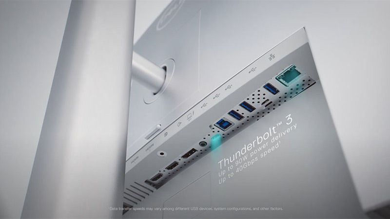 يتميز الجزء الخلفي من الشاشة بعدد مناسب من منافذ الاتصال بما في ذلك منفذي HDMI 2.0 (بعمق الوان 10 بت عند 30 هرتز) ومنفذ DisplayPort (بعمق الوان 10 بت عند 60 هرتز) ومنفذ Thunderbolt 3 / DisplayPort الذي يدعم شحن الطاقة بقدرة 90 وات.