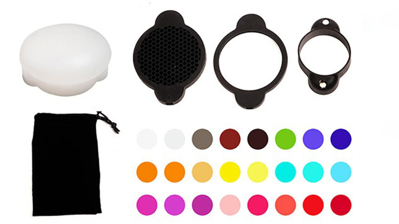 بشكل اختياري، يمكنك الحصول على حزمة تحتوي على العديد من مُعدِّلات الضوء مثل الشبكة أو مُعدِّل الانتشار بالإضافة إلى مجموعة من 24 فلتر لوني، كل شيء يتصل مغناطيسيًا بالضوء، أيضًا يمكنك الحصول على محول تركيب Bowens اختياري لتوصيل كمية كبيرة من الملحقات التابعة لشركات متوافقة اخرى.