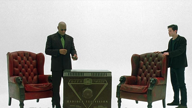 في احد المشاهد، يسأل مورفيوس “هل أردت أن تعرف ما هي المصفوفة؟” في الخلفية يمكننا رؤية وهج أزرق ينبعث من شاشات الكمبيوتر ويتسلل هذا الضوء عبر كل لقطة حتى عندما لا تكون الشاشات مرئية، يتم تصوير جميع الشخصيات المحيطة بـ Neo باستخدام عدسة طويلة ترفع الشخصيات من الخلفية.